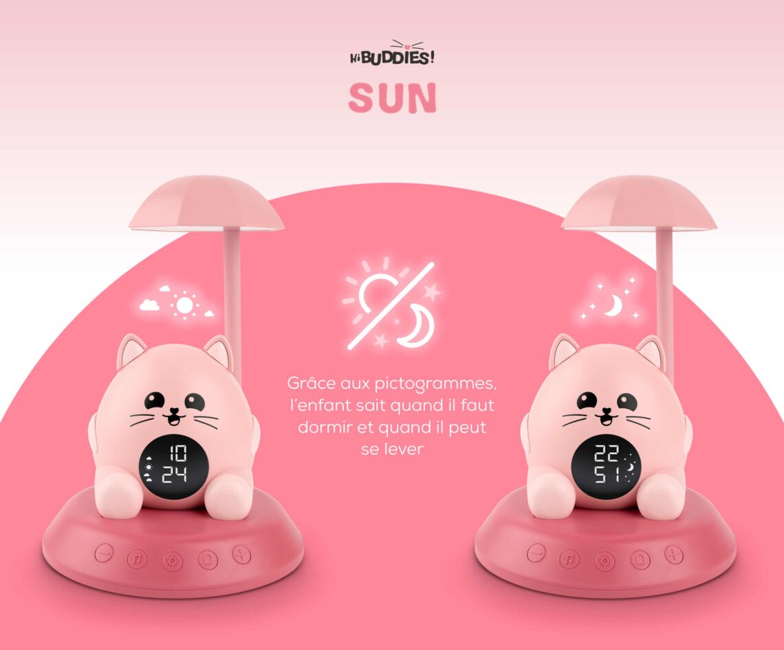 -Apprentissage du réveil : idéal pour aider les plus petits à mieux gérer leur rythme de sommeil. De petits pictos indiquent le moment idéal pour se lever !